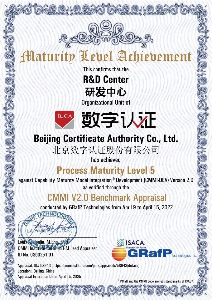 日前,北京数字认证股份有限公司顺利通过全球软件领域难度最大、规格最高的软件开发能力成熟度认证CMMI 5评估,并获得权威机构颁发的CMMI 5级证书。数字认证通过该评估,即标志着公司的软件开发成熟度、质量管理水平都已达到国际先进水平,在软件开发管理标准过程体系、过程改进实施情况、项目管理能力等方面均已获得最高的国际权威认可。