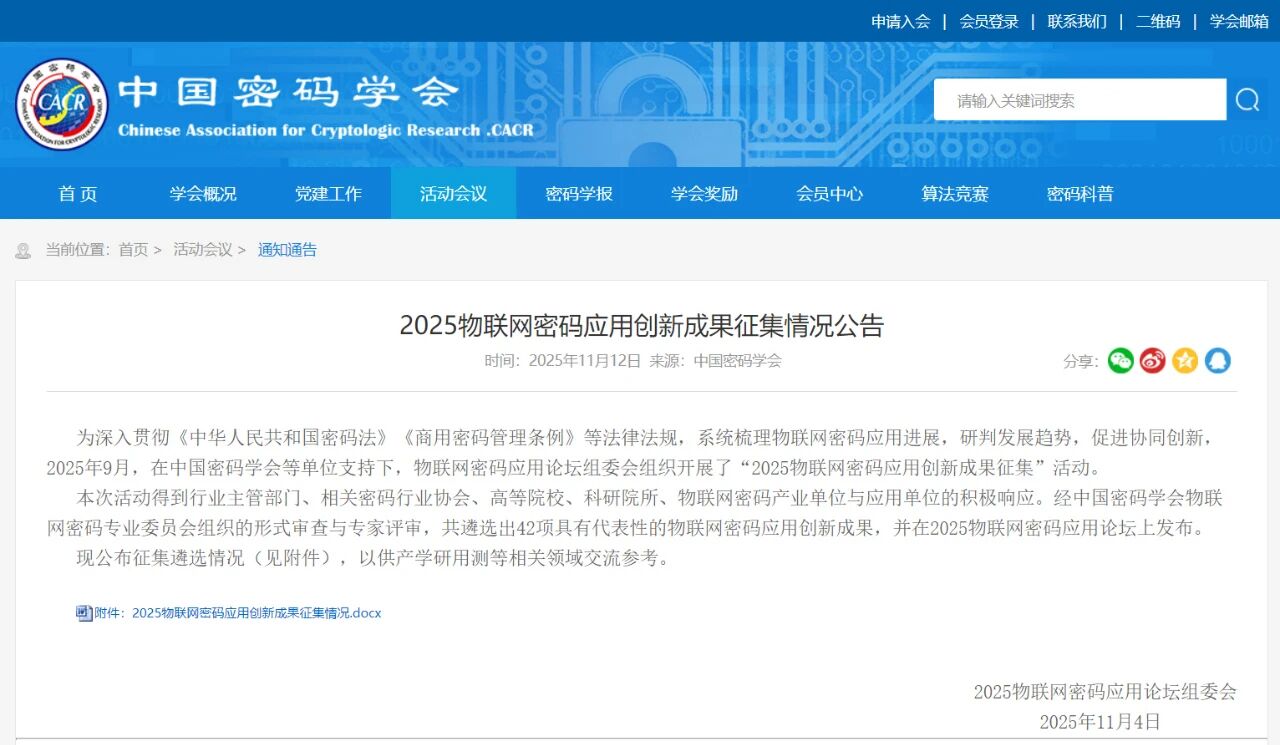 数字认证2项成果入选中国密码学会2025物联网密码应用创新成果名单
