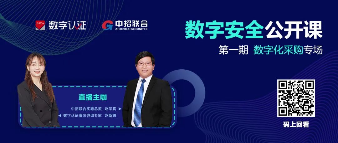 8月26日,由数字认证与中招联合举办的“数字安全公开课——第一期数字化采购专场”在线开播。本期围绕招标采购最新政策动态与电子招投标平台建设实施,分别进行了重点解读与经验分享。