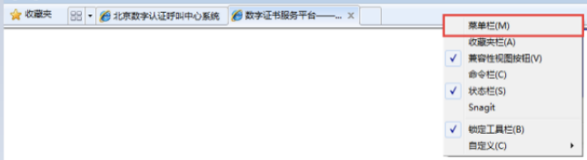 ① 若浏览器中看不到"菜单栏,可手动调出,浏览器选项卡空白处点击鼠标右键,点击"菜单栏",如下图(若浏览器中能显示菜单栏请跳过此步):