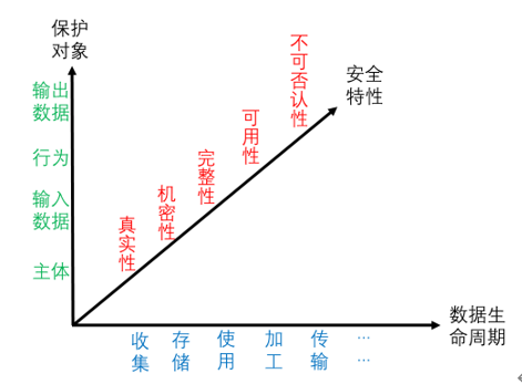 无论如何划分,数据的生命周期都是数据“存在价值”的体现。正因为数据具有价值,它才会被各类主体收集、存储并加以利用,进而有被保护的需求。生命周期的不同环节,数据可能表现出不同的价值,其安全需求也存在不同。例如从公开渠道采集的数据,其在采集阶段没有太大的机密性保护需求;但海量公开数据集中后,一旦被全部获取,则可能从中得出对国民经济有全局意义的统计数据,其价值明显提升,因此对海量集中数据及其处理结果的机密性保护需求就浮现出来。